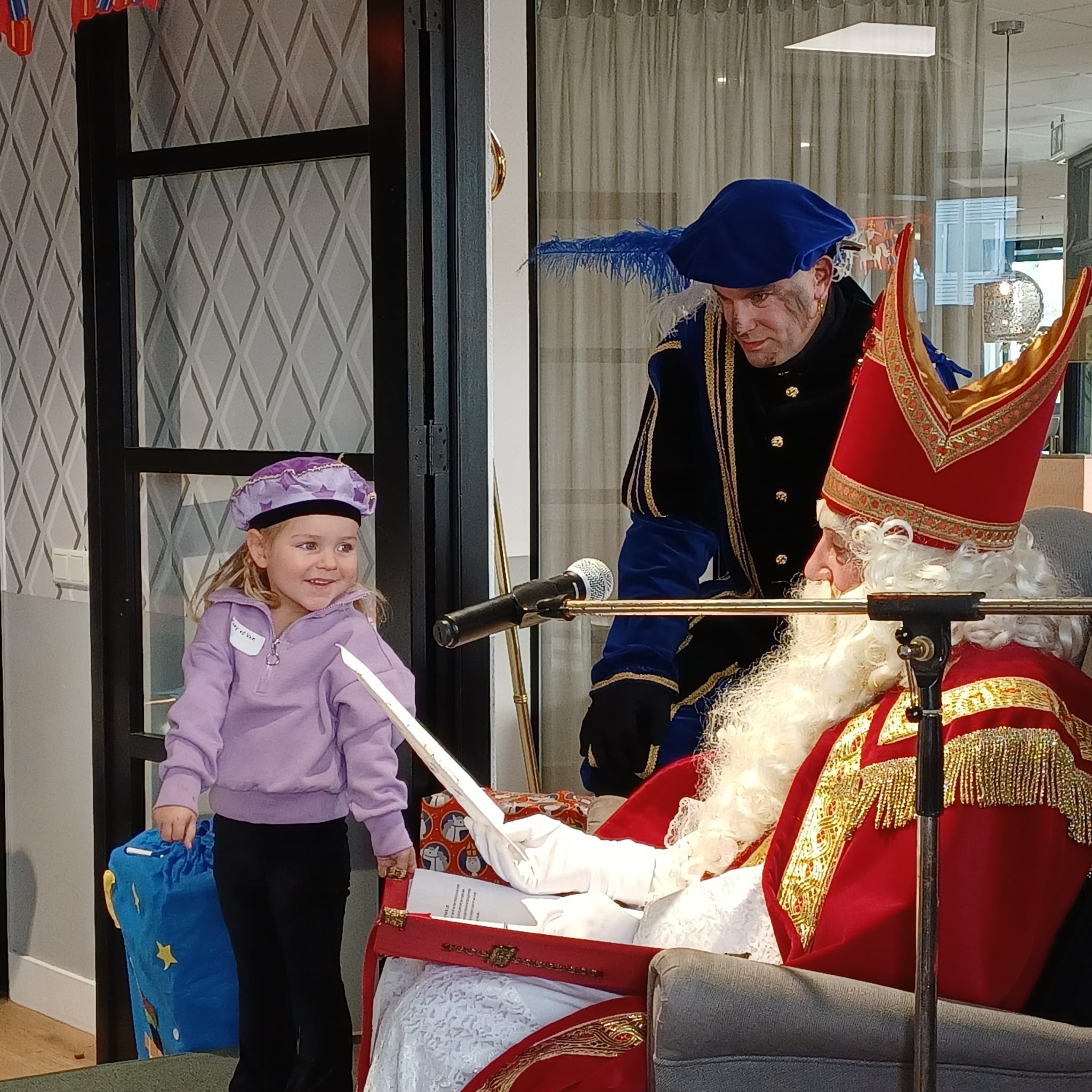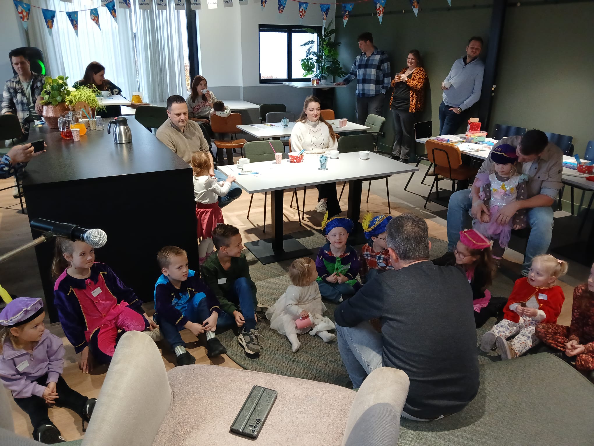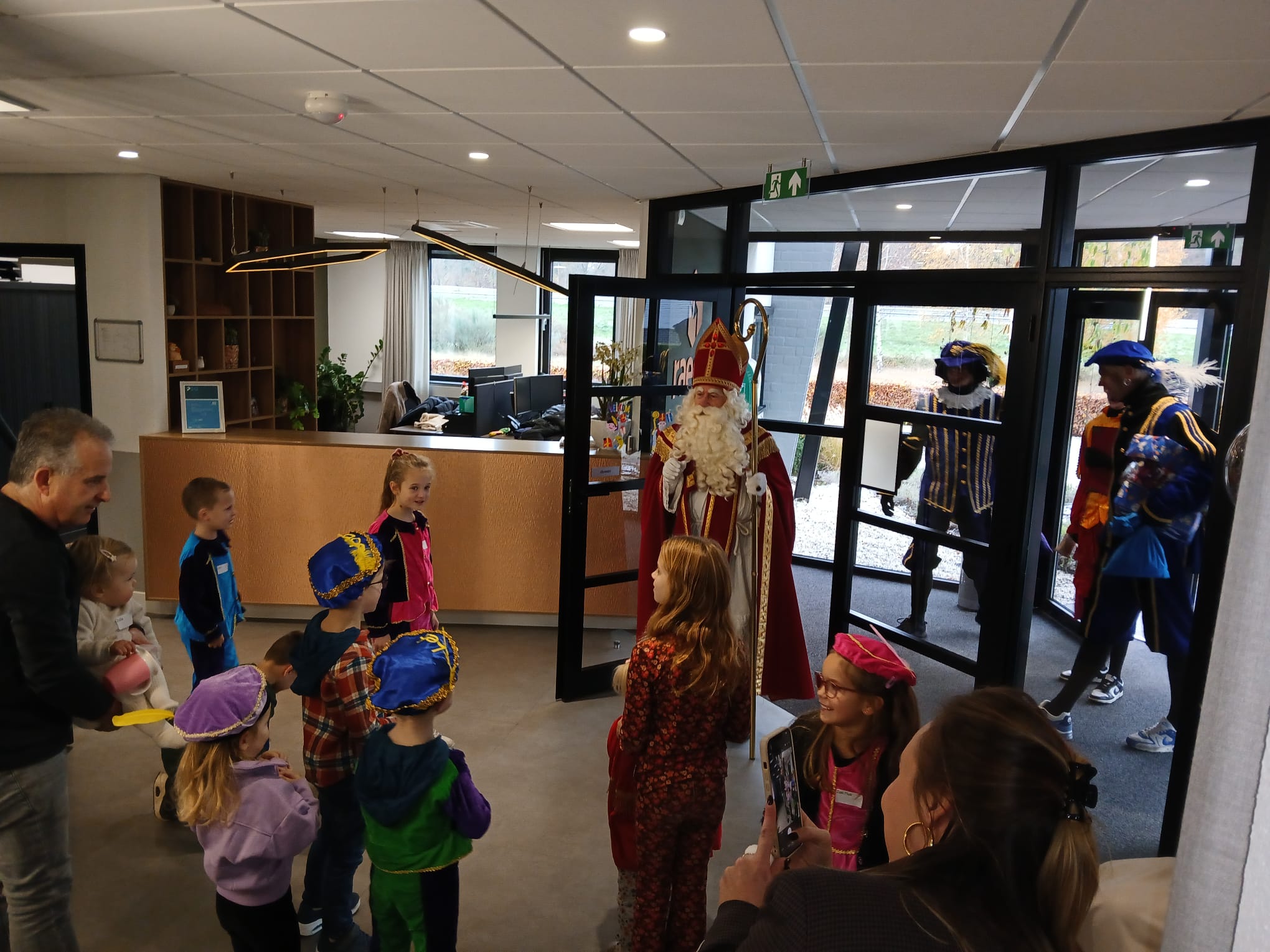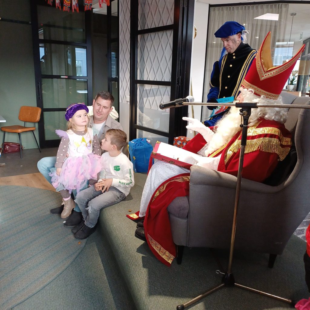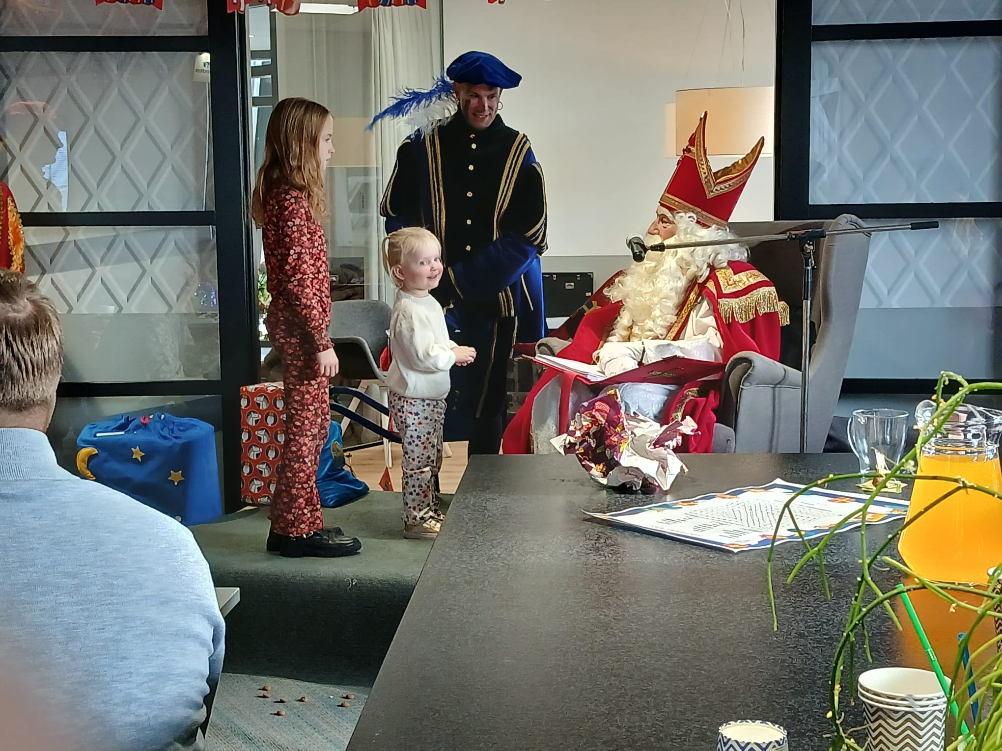 In een versierde kantine zaten alle kinderen (en ouders) vol verwachting klaar voor het bezoek van Sinterklaas en zijn Pieten. Na enkele Sinterklaasliedjes gezongen te hebben kwam de Sint met zijn Pieten het kantoor binnengelopen.